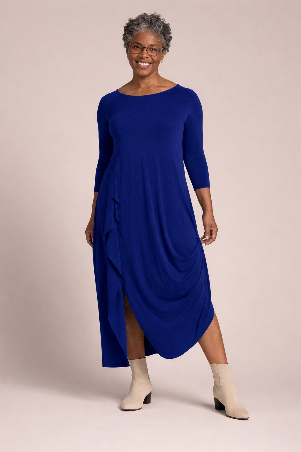 Designed with a womans shape and needs in mind, the Sympli Drama Dres, is crafted with a fluid fabric to create a beautiful, flattering silhouette and reversible crew or V-neck. This dress is ideal for any occasion, offering a front drape to conceal any perceived imperfections.
