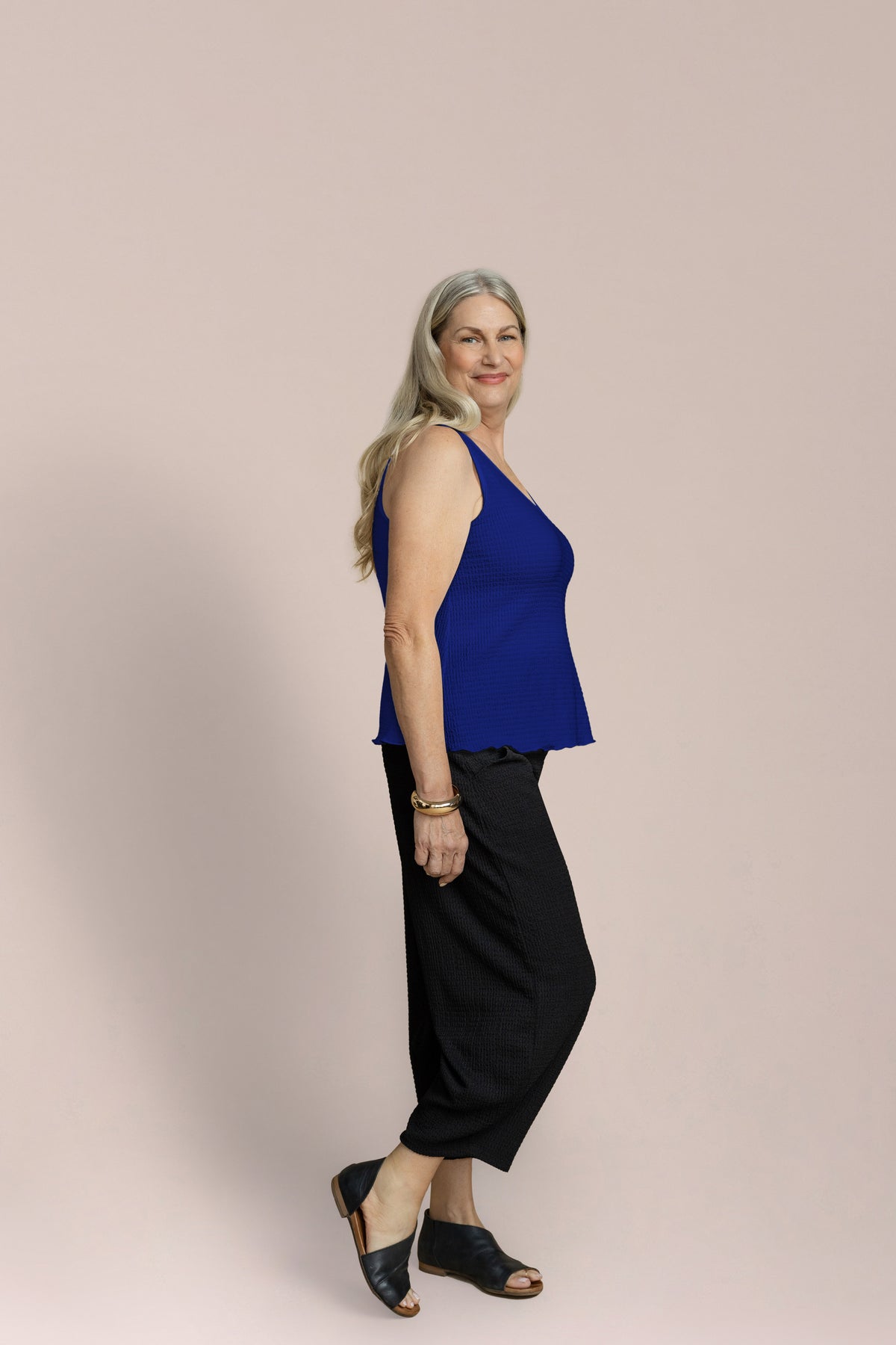 A versatile V-neck tank that works as a standalone piece or layered under your favorite jackets and cardigans. The soft, textured fabric drapes beautifully while the relaxed fit keeps you comfortable all day. Flattering neckline and wider straps offer excellent coverage and support.