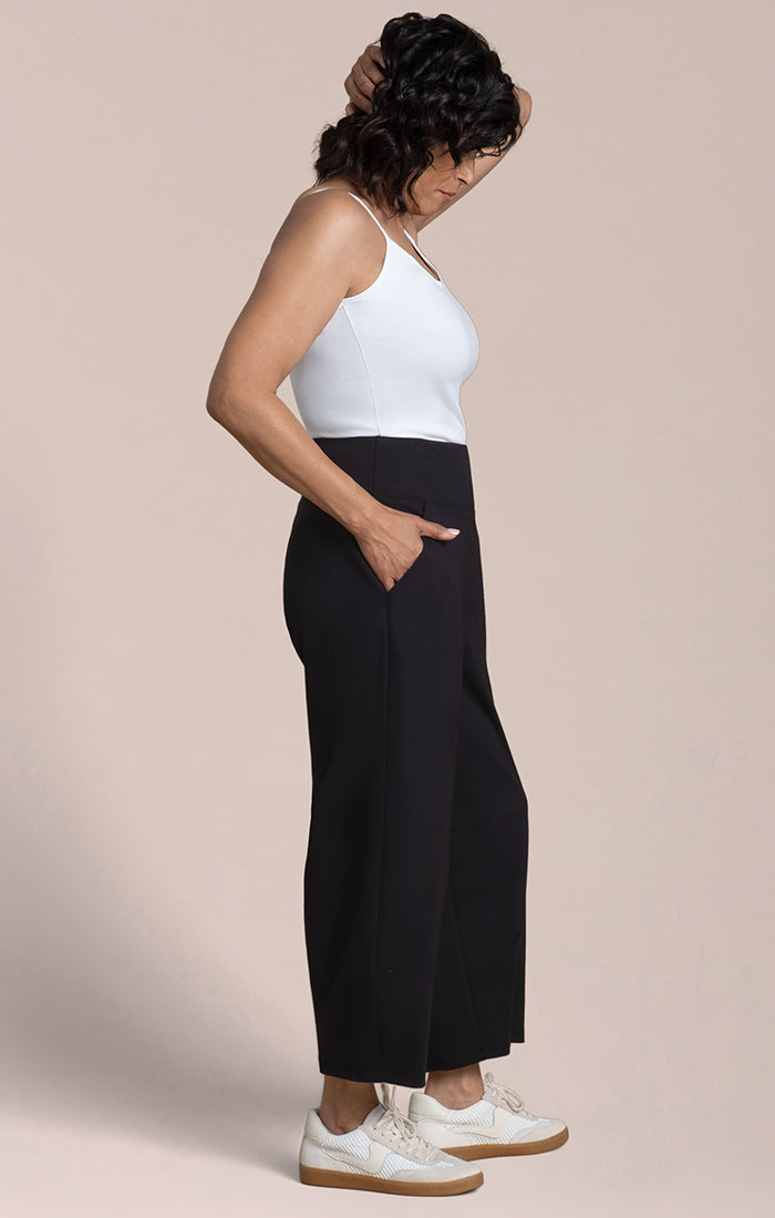 Narrow Lantern Pant in lightweight ponte fabric offers a flattering fit with a slimming leg and 24" inseam. The supportive fold-over waistband ensures all-day comfort while the tapered silhouette creates a polished, effortless look that works for most heights.