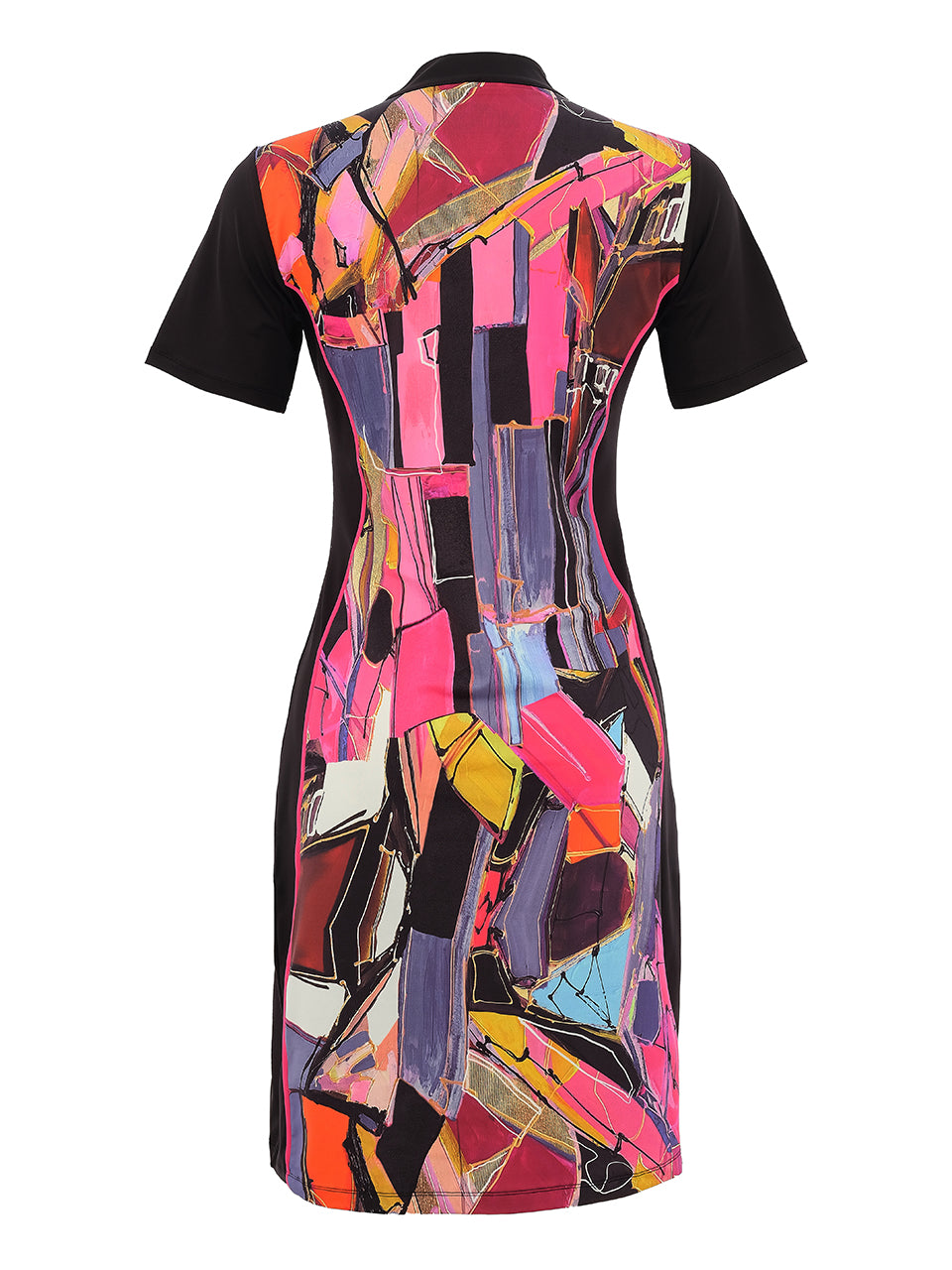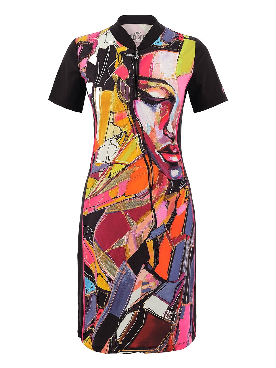 Stand out on and off the course with this striking artistic golf dress. Featuring a vibrant abstract portrait print, this sporty silhouette combines bold style with effortless comfort. The zip neckline and short sleeves add a polished athletic touch, while the flattering fit allows easy movement throughout your game. Perfect for sunny rounds, resort wear, or casual outings, this eye-catching dress brings color, confidence, and modern artistry to your golf wardrobe.