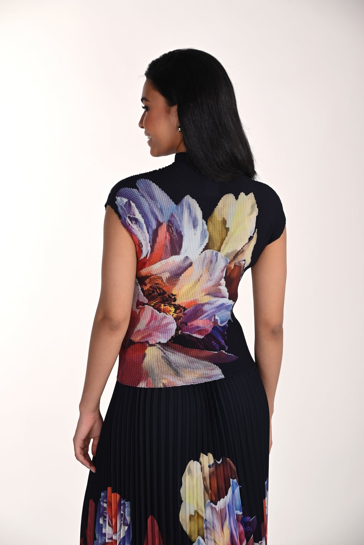 Black knit top with an eye-catching oversized floral print in lavender, blush, gold, and berry tones. The textured knit fabric adds depth while the mock neckline and cap sleeves deliver a modern, polished look. Versatile enough to pair with trousers, skirts, or layer under jackets for effortless sophistication.