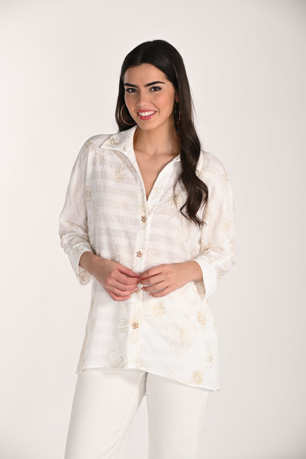 Elegant and versatile, this floral woven blouse combines delicate gold embroidery with soft striping for understated sophistication. The classic collar, button front, and three-quarter sleeves create a polished silhouette that transitions seamlessly from day to night. Lightweight and beautifully textured, it's the perfect piece to elevate any wardrobe with timeless style.