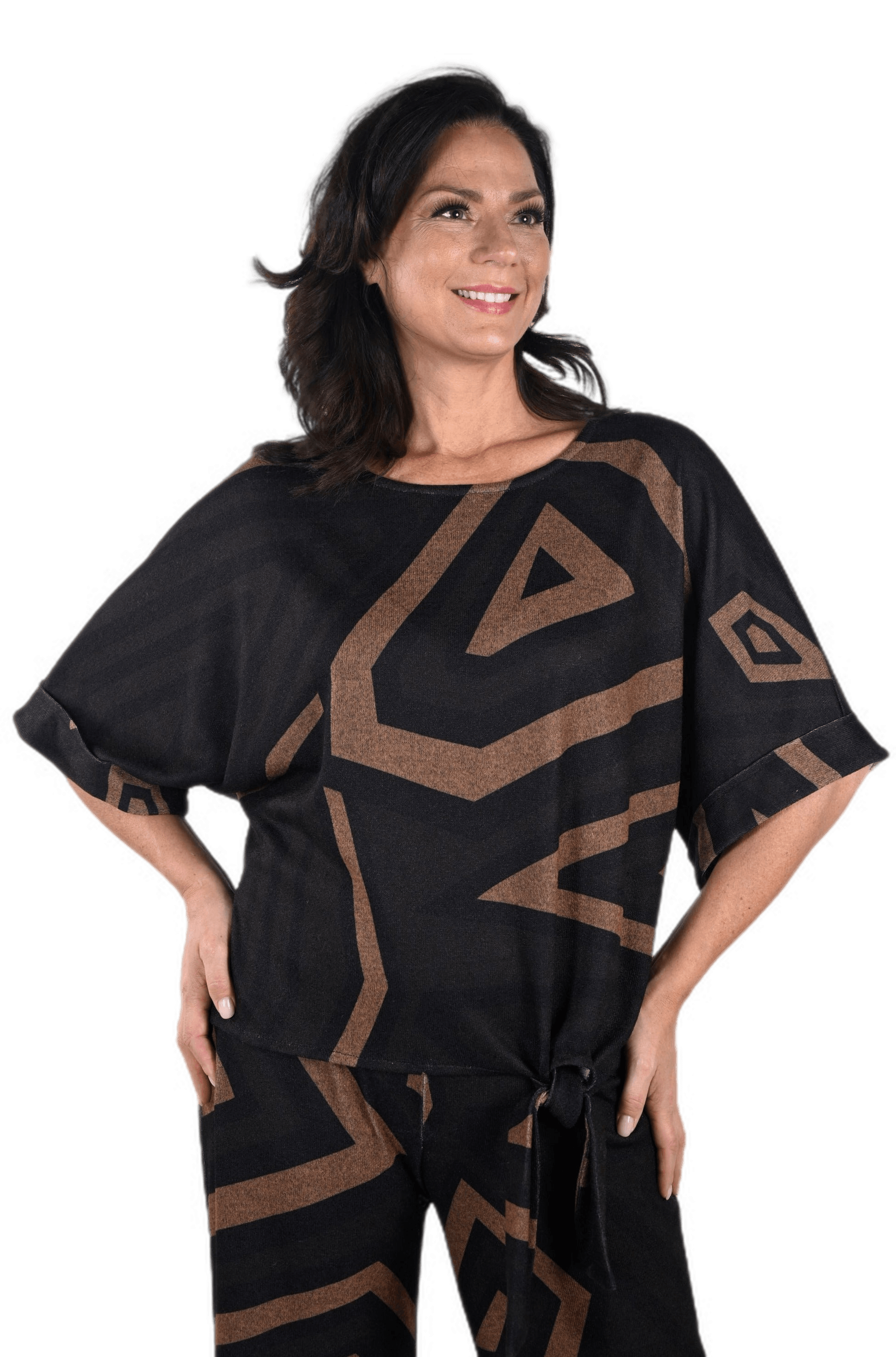 This black/brown top features an eye-catching abstract print, adding a touch of artistic flair to your outfit. The flowy elbow-length sleeves provide a graceful and breezy feel, perfect for both casual and dressier occasions.100% Polyester
