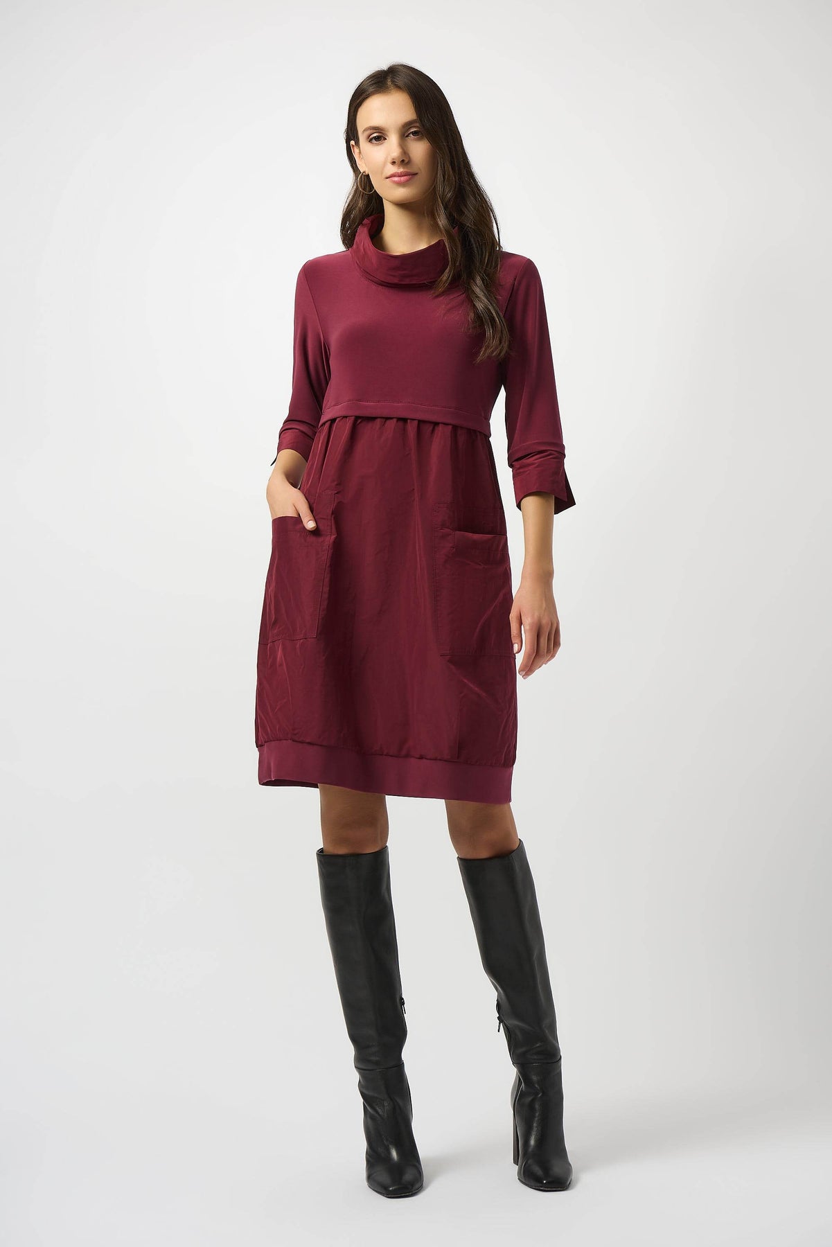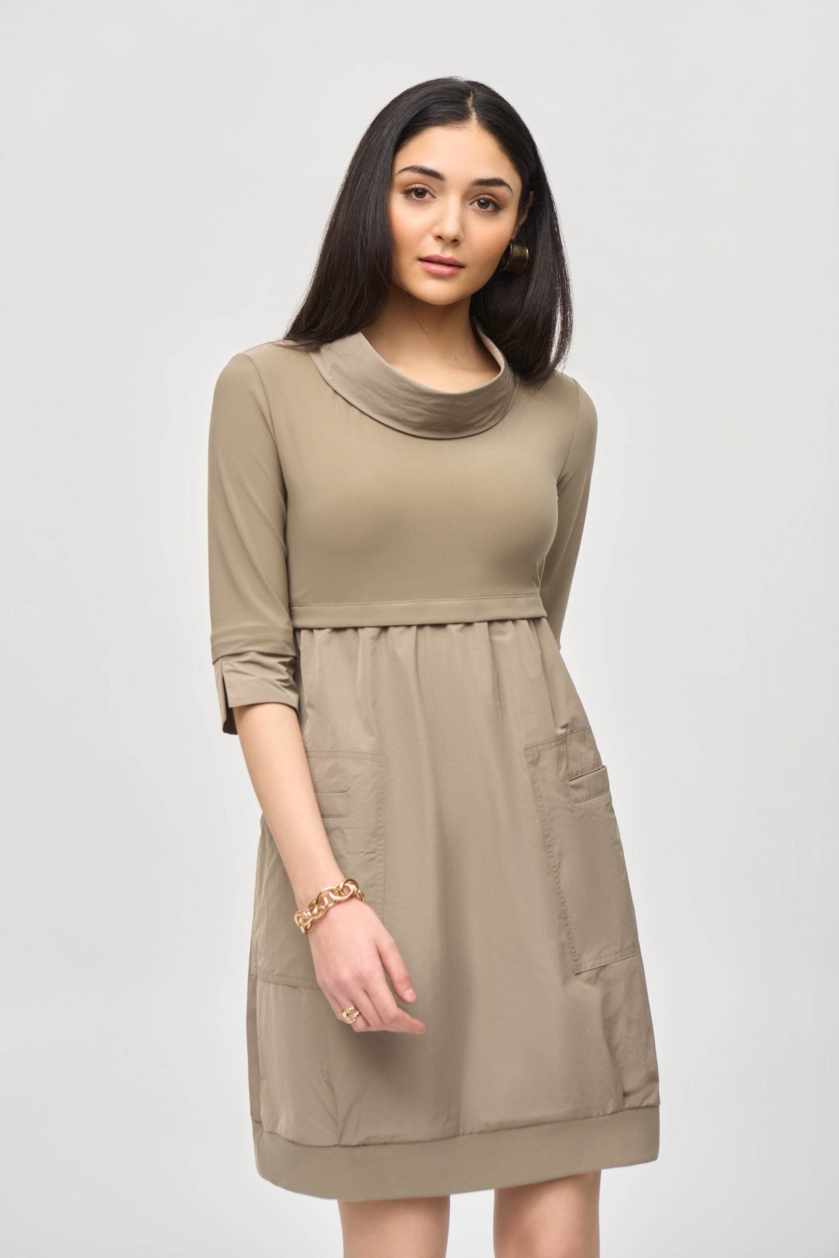 Elevating your figure with an empire waist and exquisite shirring, this knee-length cocoon dress exudes poise and sophistication. Crafted from luxurious Memory fabric and a smooth knit material, it boasts three-quarter length cuffed sleeves, front pockets, and a chic stand collar. It's a ready-to-wear essential that will make you feel confident and elegant.