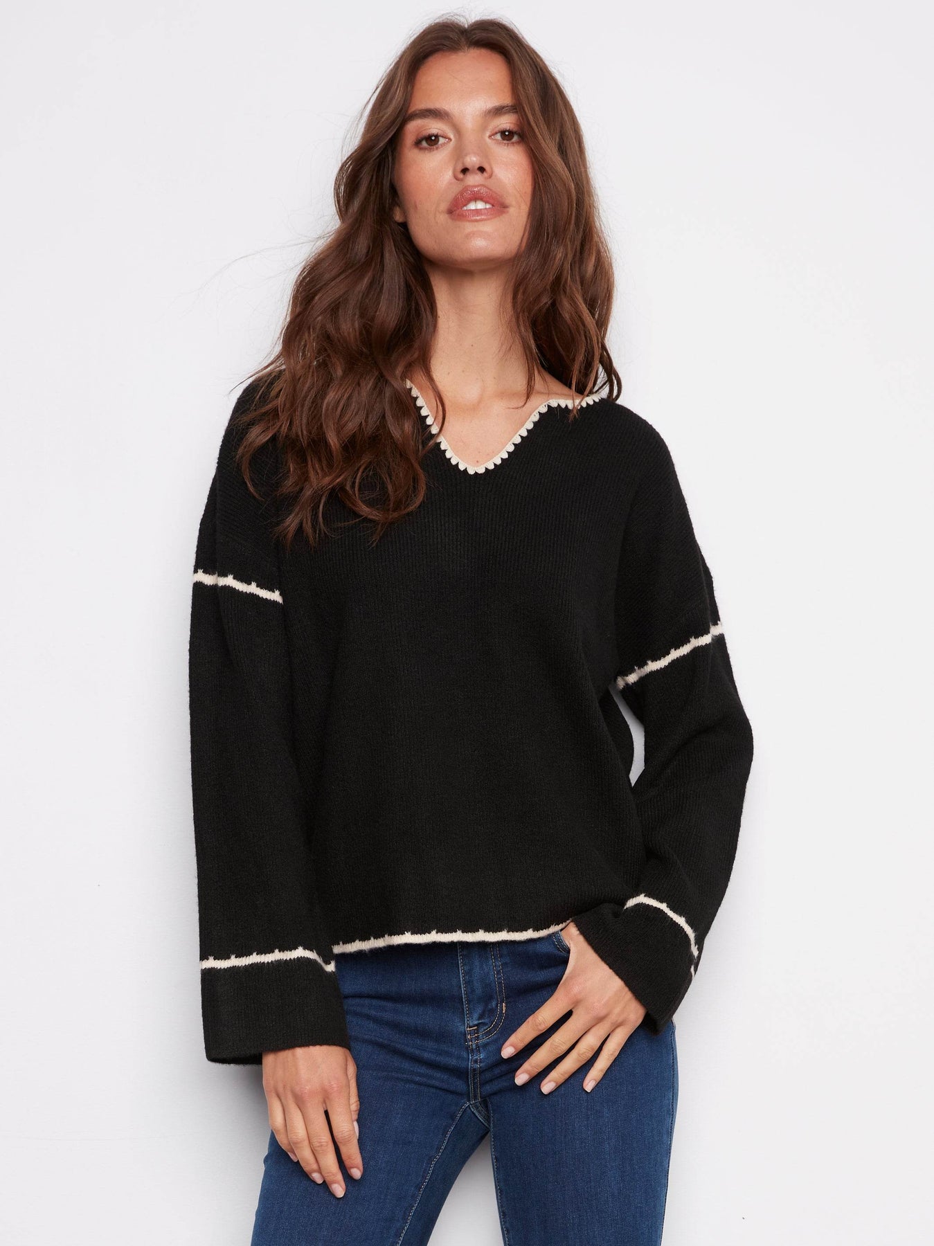 Embroidered Ribbed Sweater with Notch Neck - Dream Pants