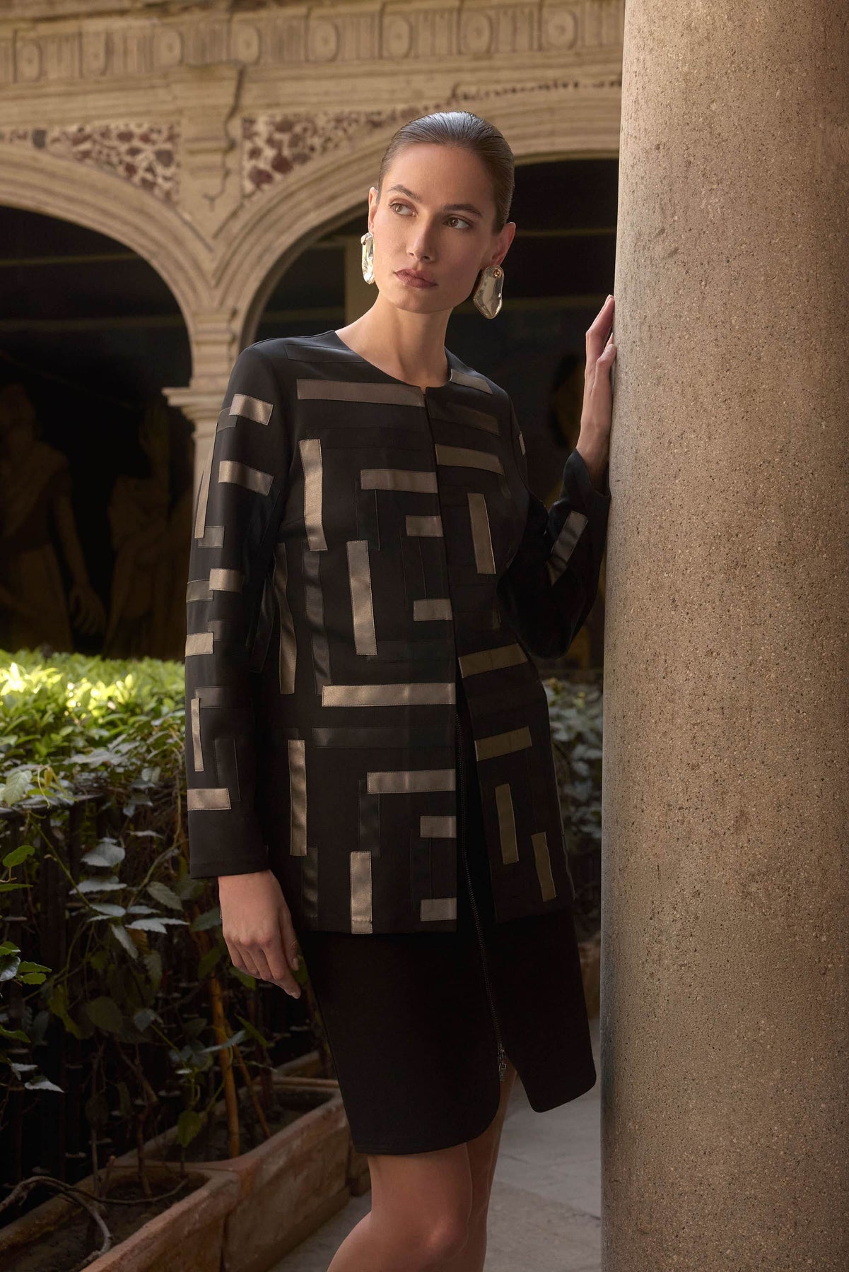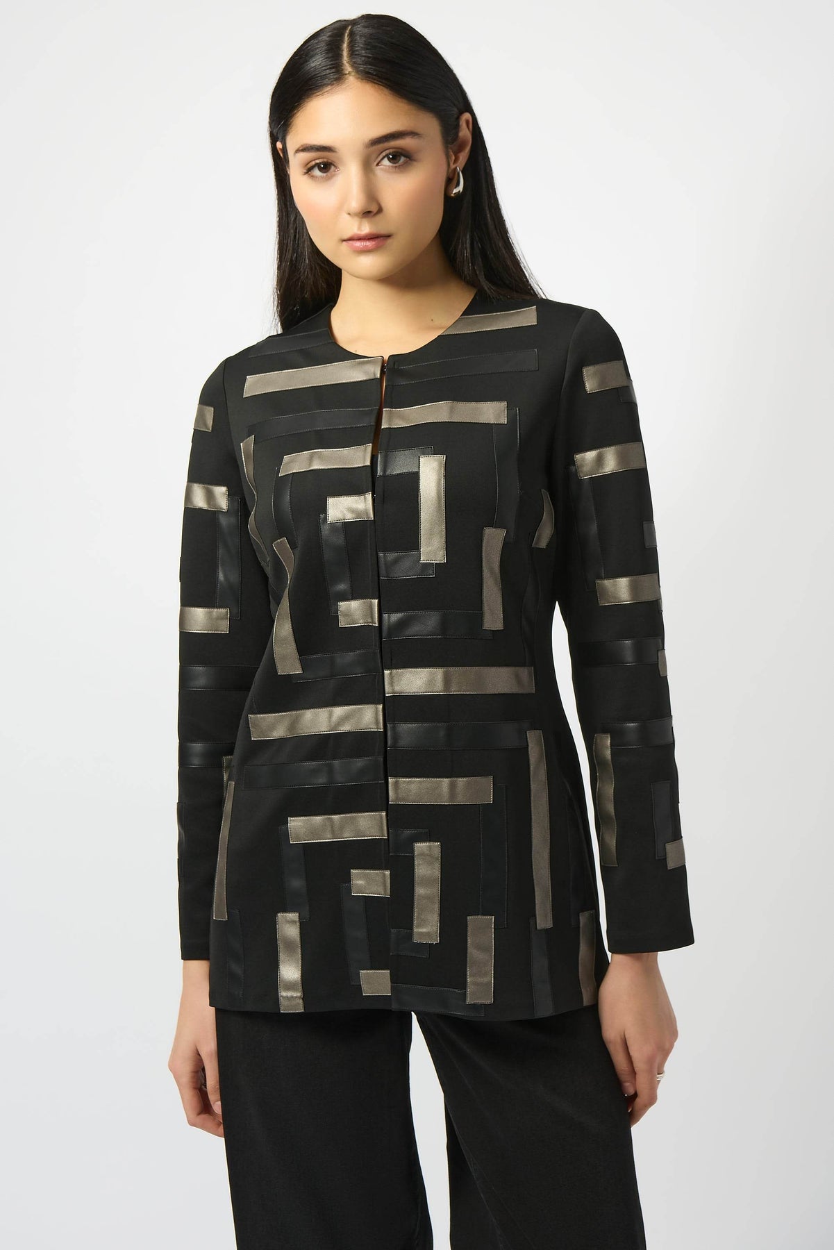 Indulge in effortless standout style with this collarless scuba knit jacket. Its bold two-tone faux leather patches add an artistic touch, while its long, straight sleeves offer a sleek and modern look. With a discreet hook-and-eye closure, this piece exudes polished sophistication that will leave a lasting impression.