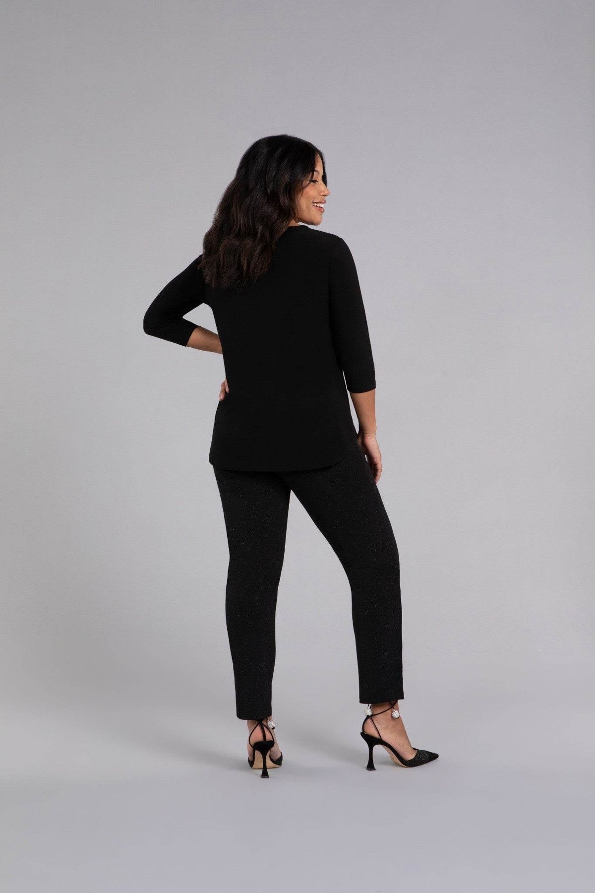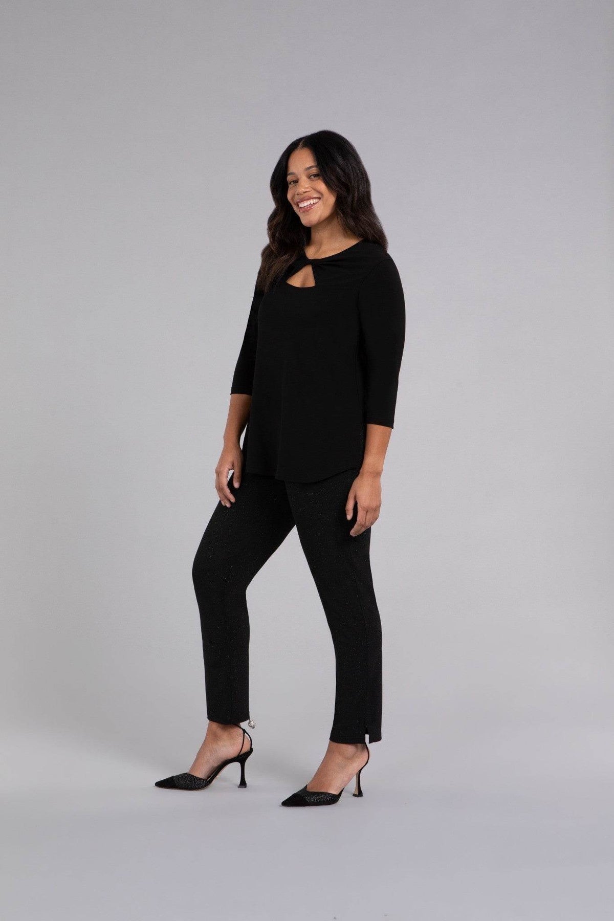 The Twist Top brings a playful edge with its distinctive triangular front cutout, especially striking in vibrant red. Designed with a shirttail hem and side slits, it offers both style and comfort, complemented by flattering 3/4 length sleeves.