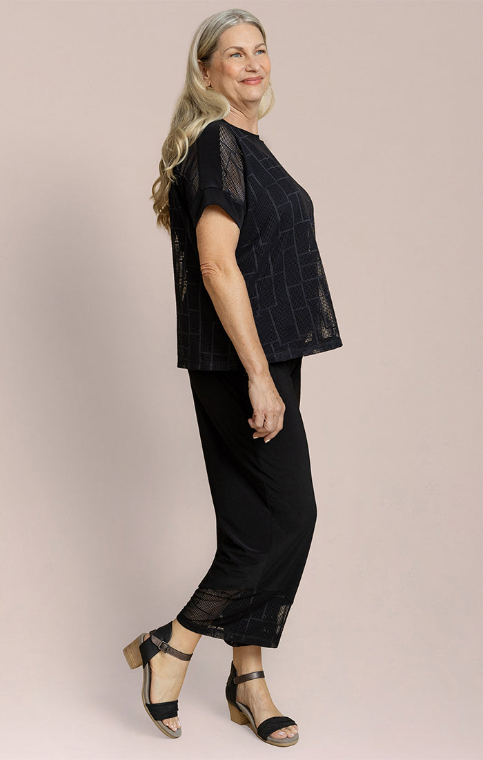Elevate your evening style with this sophisticated sheer overlay top. Designed with a relaxed silhouette, this piece features a lightweight mesh layer adorned with subtle geometric detailing that adds texture and dimension. The soft short sleeves and easy drape create a flattering, comfortable fit, while the opaque lining ensures effortless wear. Perfect for pairing with dress pants or skirts, this elegant top transitions seamlessly from dinner events to special occasions with refined, modern charm.