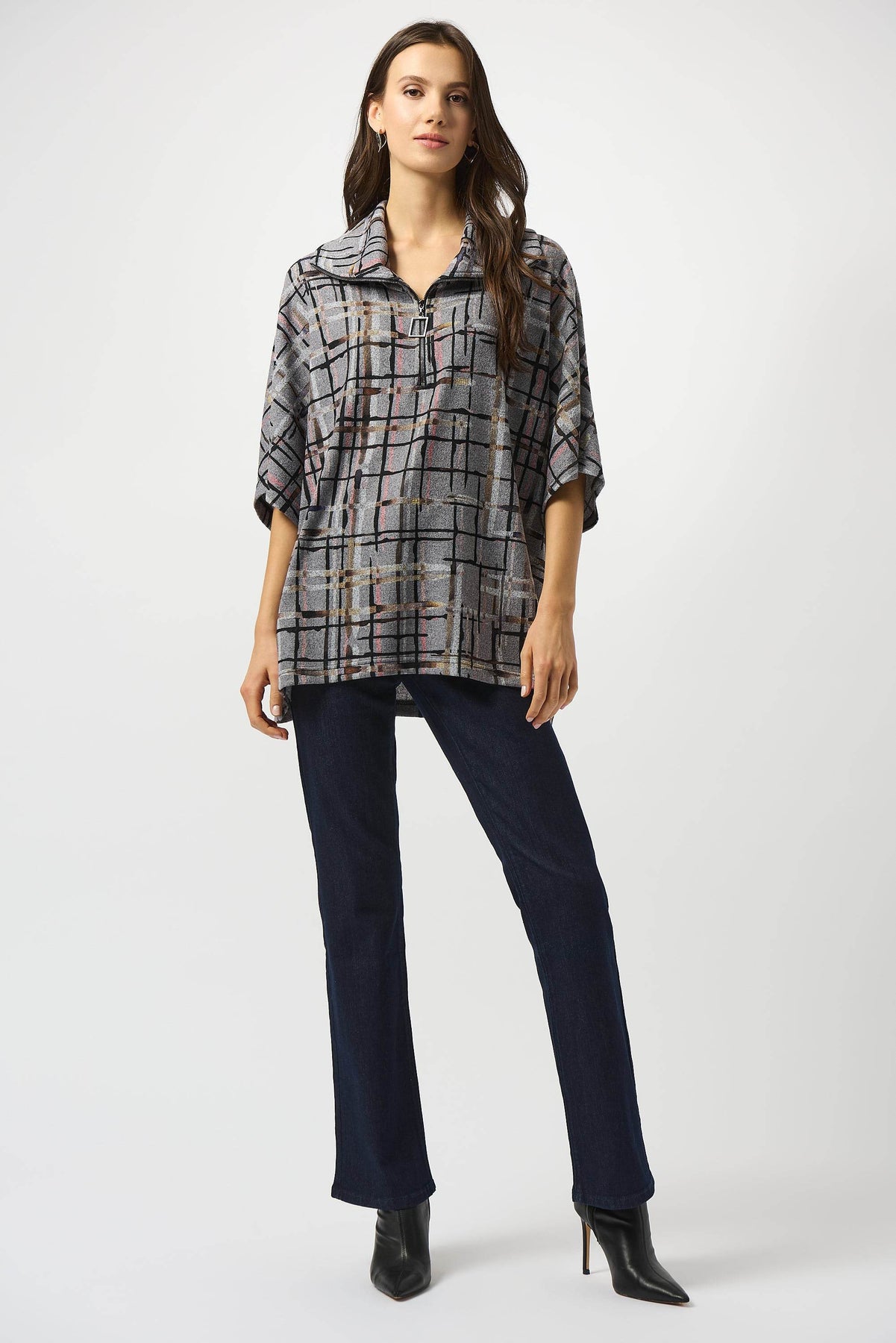 Confectionné en maille à carreaux douce et confortable, ce haut allie une élégance classique à une touche de modernité. Sa coupe carrée et ses manches trois-quarts dolman lui confèrent un style à la fois décontracté et chic. Le col zippé apporte une note élégante et fait de cette pièce un incontournable pour sublimer votre garde-robe en toute simplicité.