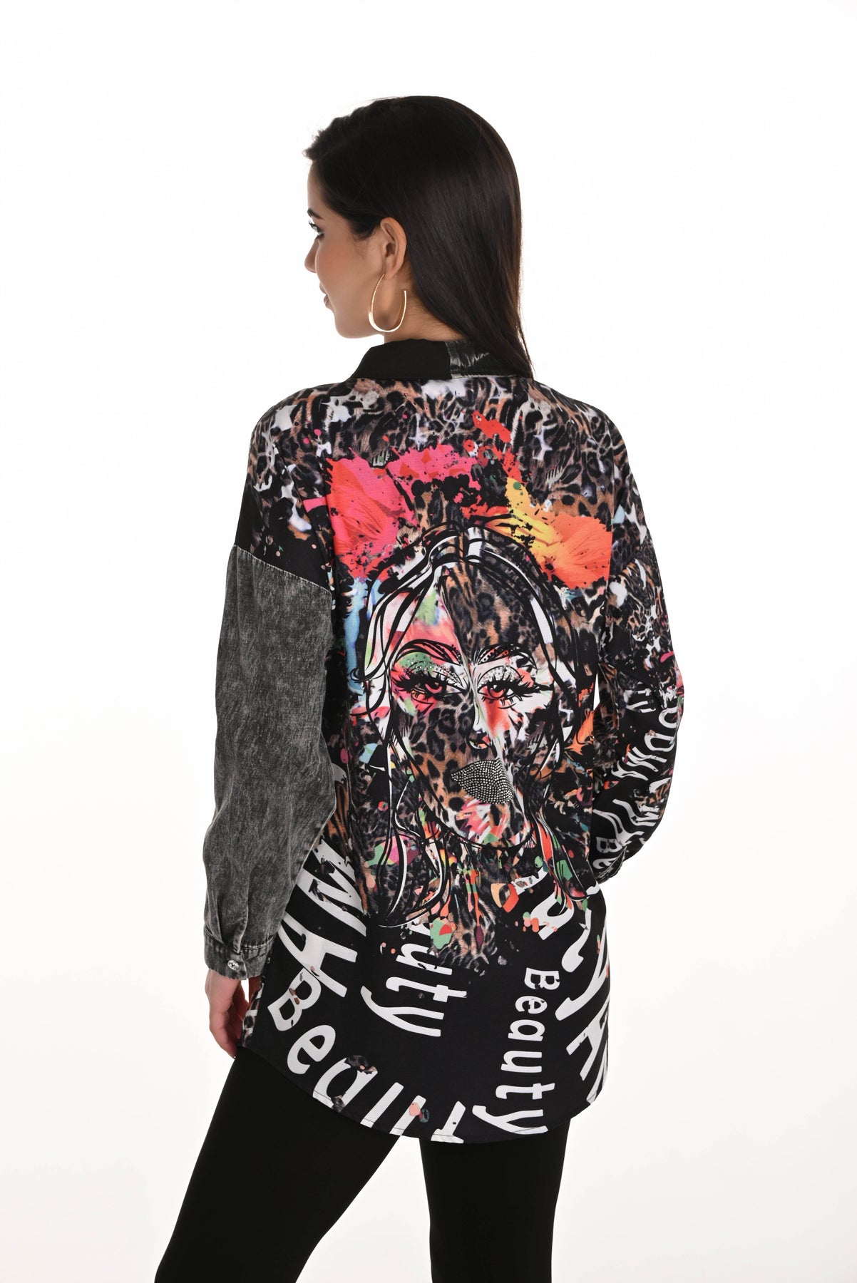 Faites sensation avec cette chemise boutonnée audacieuse qui sort de l'ordinaire. Mêlant denim, imprimé léopard, inscription façon graffiti et un portrait abstrait vibrant au dos, cette pièce forte allie style streetwear et créativité artistique. Sa coupe décontractée et ses manches retroussables assurent un confort optimal ; elle est idéale pour les jours où vous souhaitez que votre tenue parle d'elle-même.