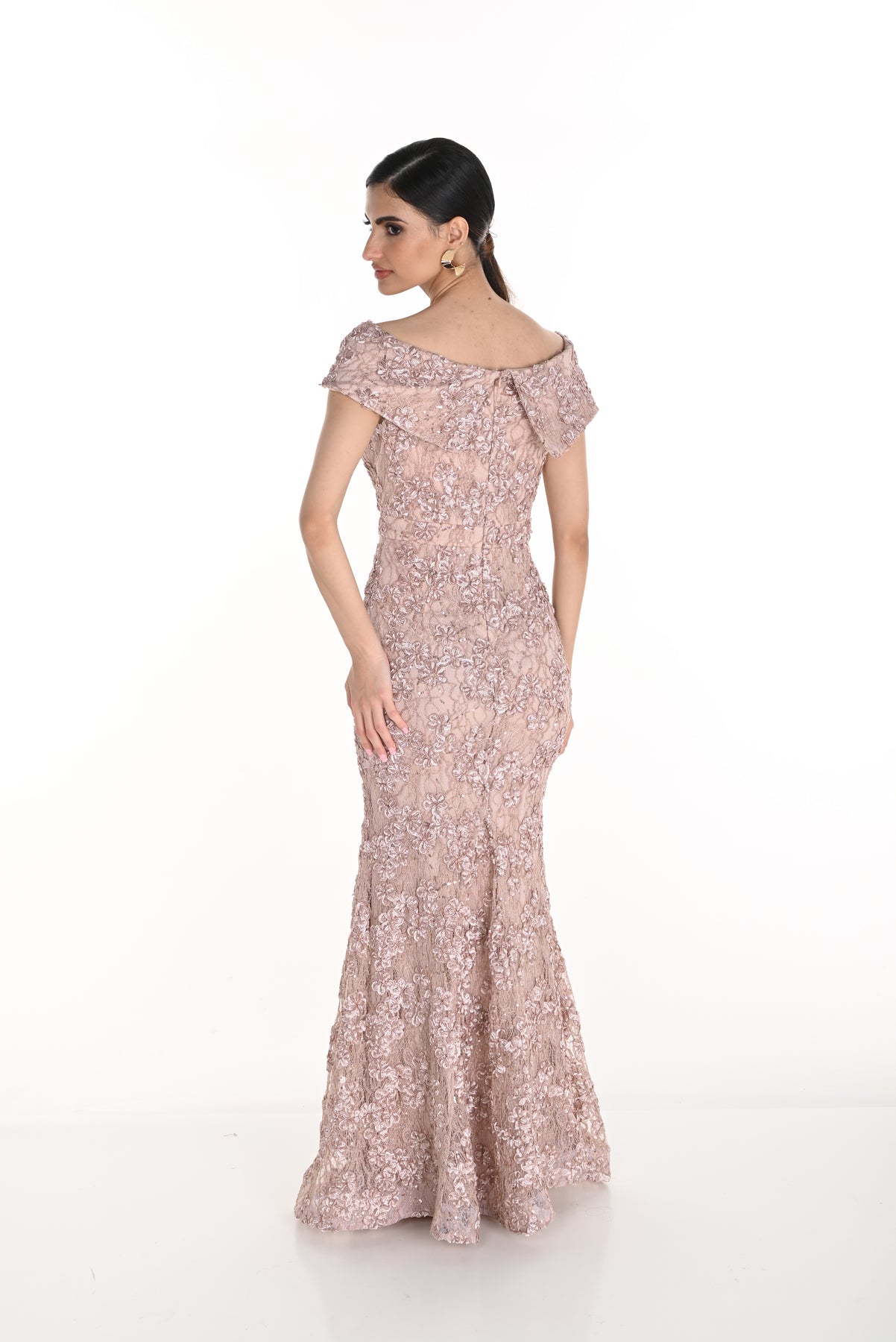 Off-Shoulder Lace Gown with Floral Embellishments Frank Lyman