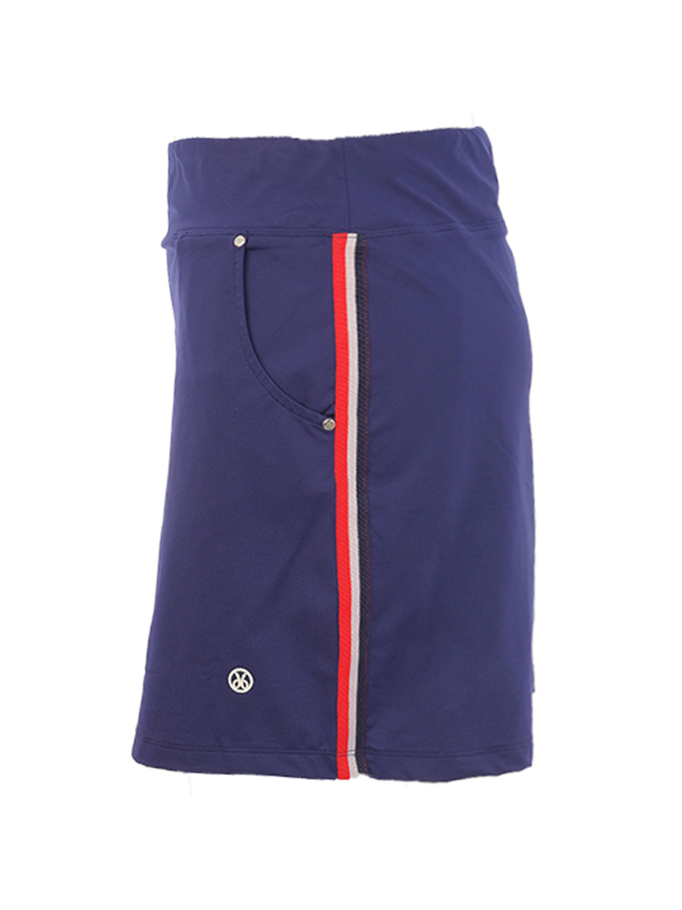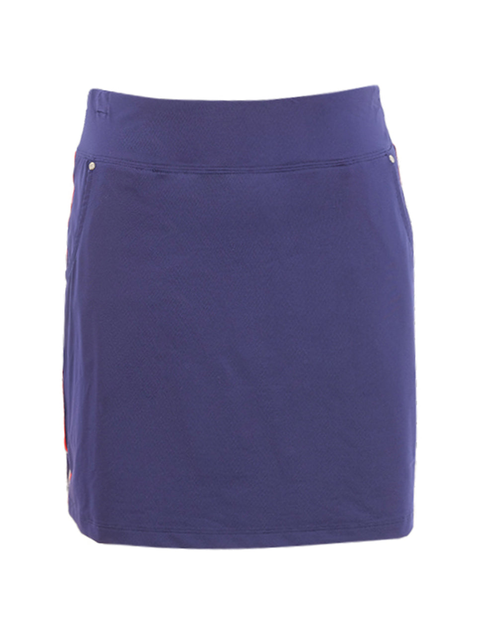 A sleek and sporty skirt designed for effortless movement and everyday style. This pull-on silhouette features a comfortable wide waistband and a streamlined fit, accented by a bold contrast stripe running along the side for a dynamic athletic touch. Functional pockets add practicality, making it perfect for active days on or off the court.