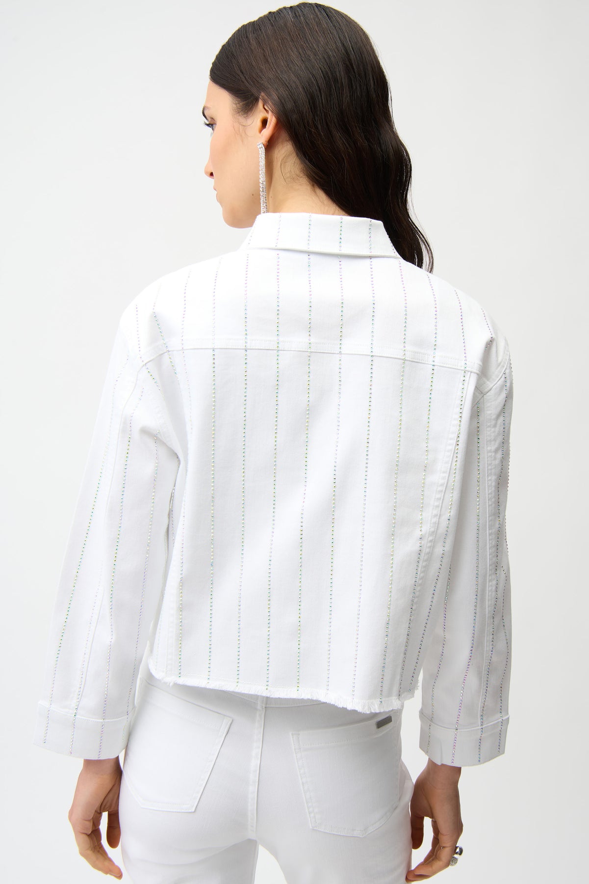 Elevate your denim game with this stunning Joseph Ribkoff jacket. Crafted from soft, stretchy FEATHERWEAVE™ fabric, it combines comfort with edge—featuring eye-catching rhinestone details and a frayed hem that demands attention. The perfect piece to transform any outfit into something unforgettable.