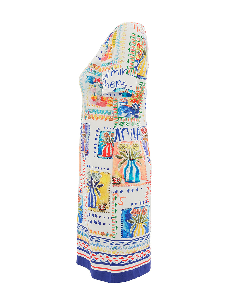 A vibrant statement piece with an artistic touch, this midi dress features a playful patchwork of hand-drawn floral and vase motifs. Designed with a clean, straight silhouette and short sleeves, it offers an easy, flattering fit that falls just below the knee. The smooth, lightweight fabric keeps it comfortable for all-day wear, while the bold print adds a fresh, expressive feel perfect for warm-weather styling.