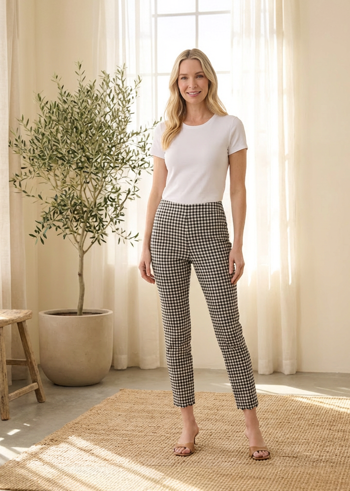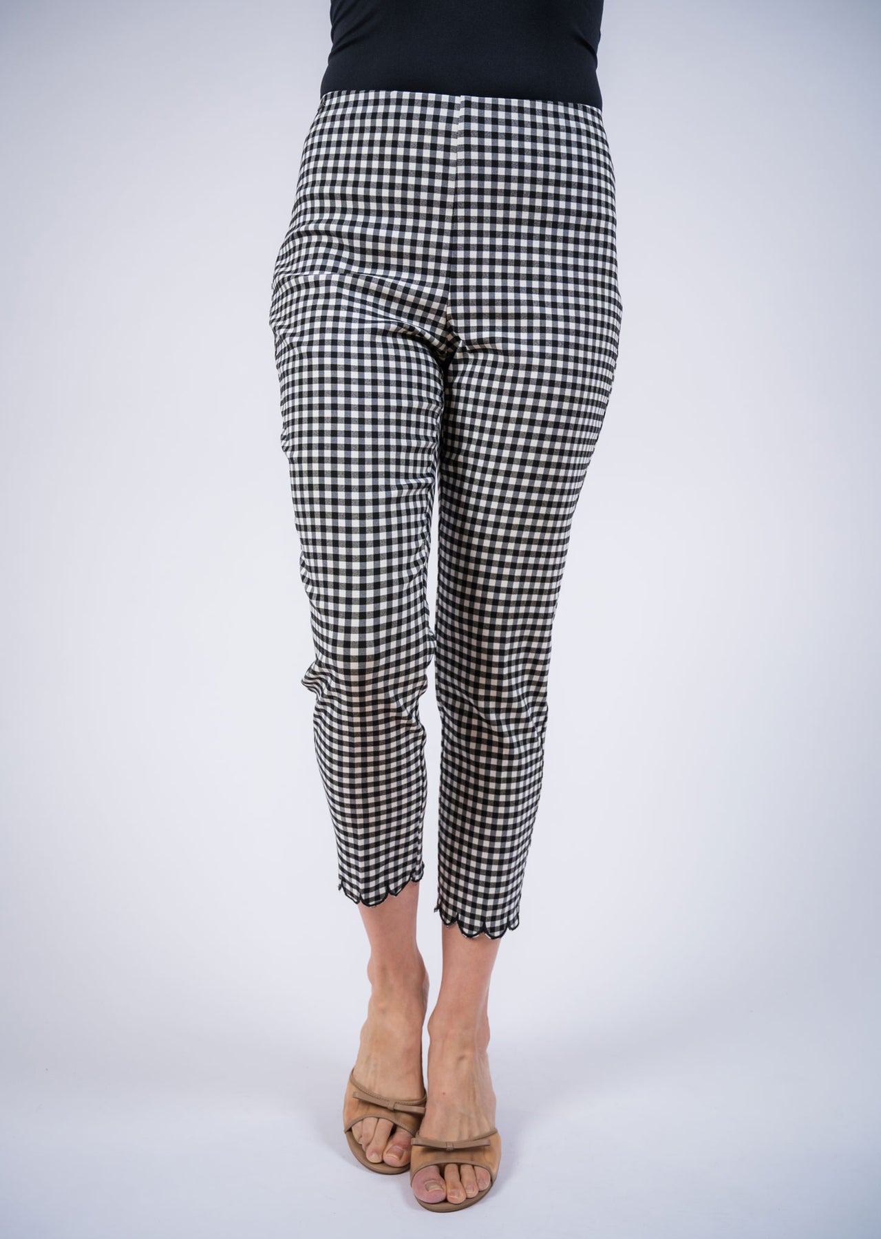 Chic and effortlessly polished, these cropped pull-on pants feature a timeless gingham pattern that adds a playful yet sophisticated touch to any outfit. Designed with a smooth pull-on waistband for a flattering, comfortable fit, the slim silhouette gently contours the body while maintaining ease of movement. The ankle-length cut is finished with a delicate scalloped hem, adding a feminine detail that elevates the