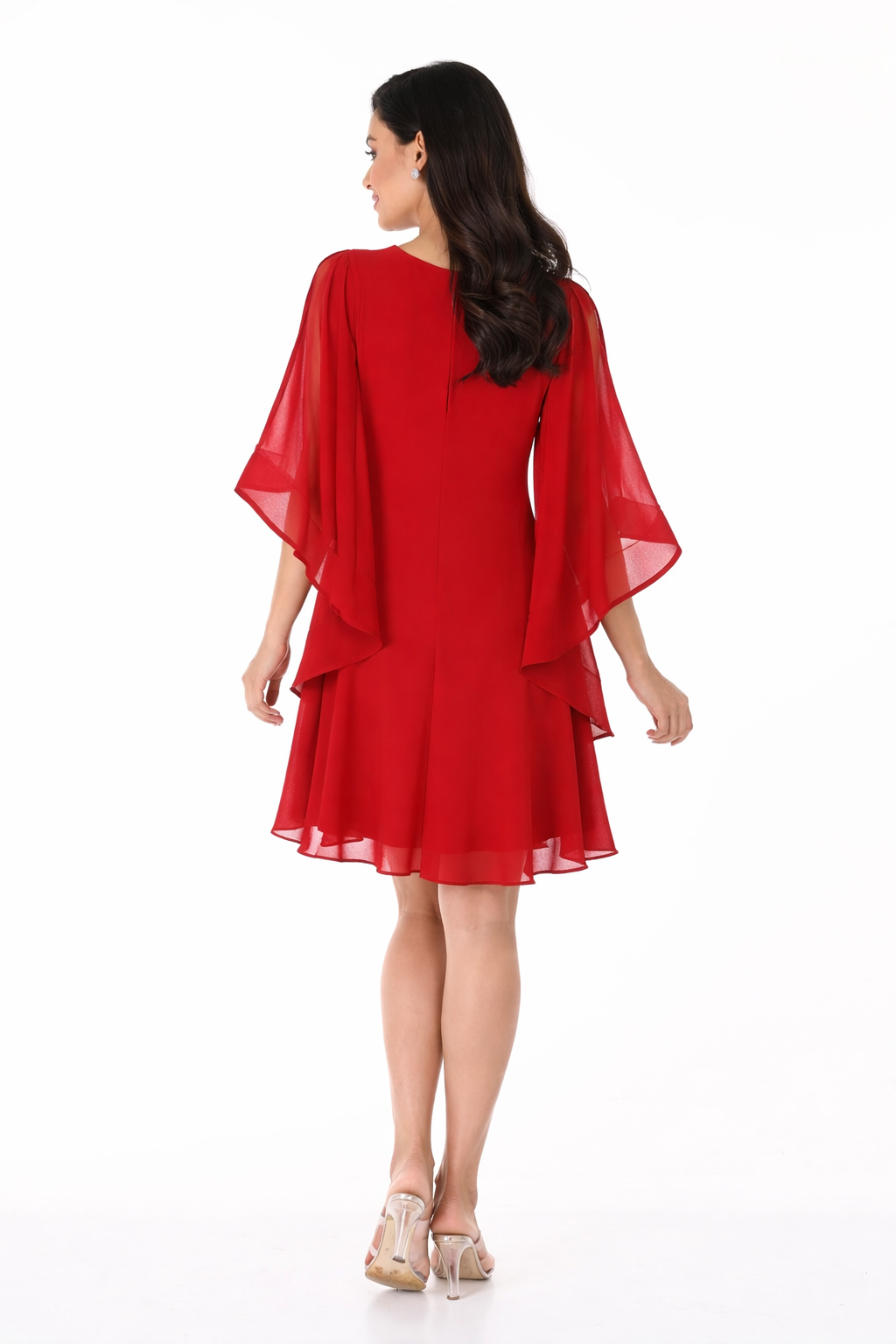 This chiffon dress combines understated luxury with wearable comfort. Cape-inspired sleeves and a fluid A-line cut create an instantly polished look, while the airy layered fabric moves gracefully with you. Whether you're attending a wedding or evening event, this piece delivers timeless sophistication without sacrificing ease.