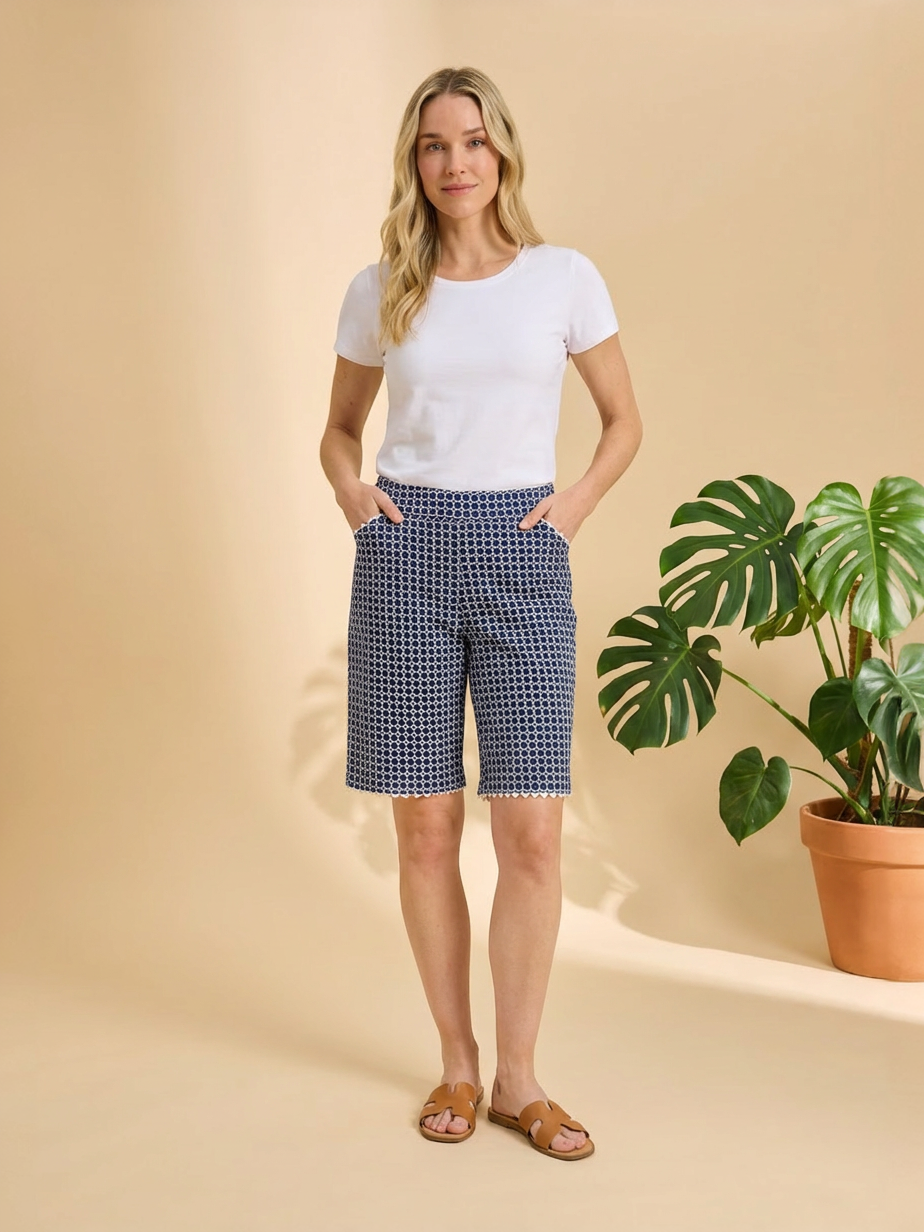 These patterned pull-on Bermuda shorts offer the perfect balance of comfort and polished style. Designed with a flattering mid-rise waistband and a sleek straight-leg silhouette, they provide an easy, streamlined fit for everyday wear. The modern geometric print adds visual interest, while the scalloped hem detail gives the design a refined finishing touch. Lightweight and versatile, these shorts pair effortlessly with simple tops and sandals for a relaxed yet elevated warm-weather look.