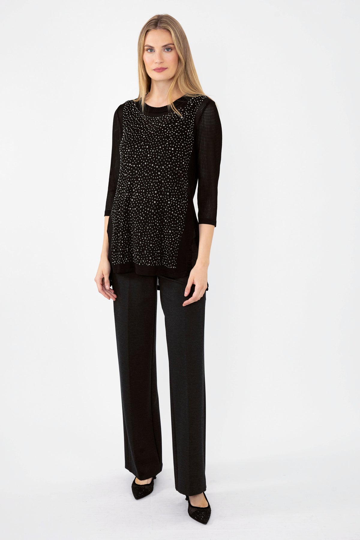 This elegant tunic top features a cascade of shimmering stud details that create a subtle sparkle across the front. Designed with sheer mesh sleeves and a relaxed silhouette, it offers lightweight comfort with a touch of glamour. Perfect for pairing with sleek pants for an effortlessly polished evening look. ✨