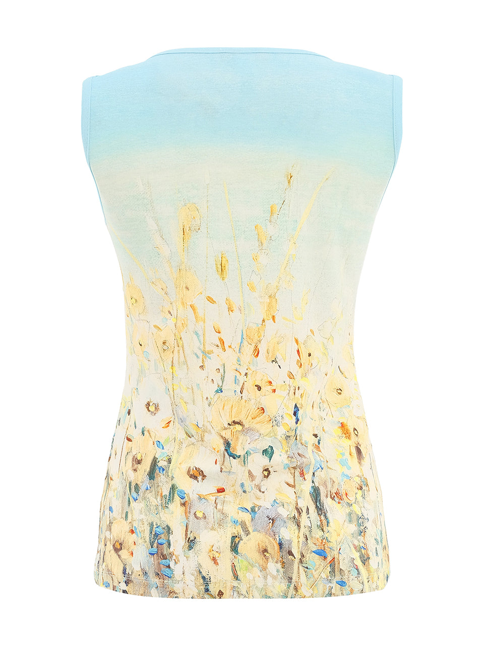 A soft, artistic V-neck top featuring a serene floral print that blends airy blues with warm golden tones. Designed with a relaxed silhouette and cap sleeves, it offers effortless comfort and a flattering drape. Lightweight and easy to style, it pairs perfectly with denim or summer bottoms for a polished everyday look.