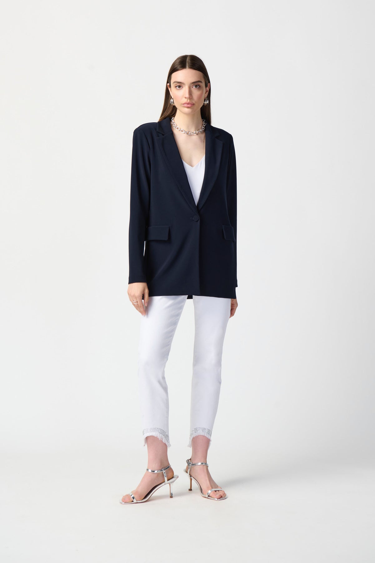 Elevate your wardrobe with this effortlessly stylish blazer. Made from a smooth, silky knit, it features a straight fit and an extended hem for a modern look. Designed with a notched collar, long sleeves, two front pockets, and a button-front closure, this blazer brings sophistication and polish to any outfit.