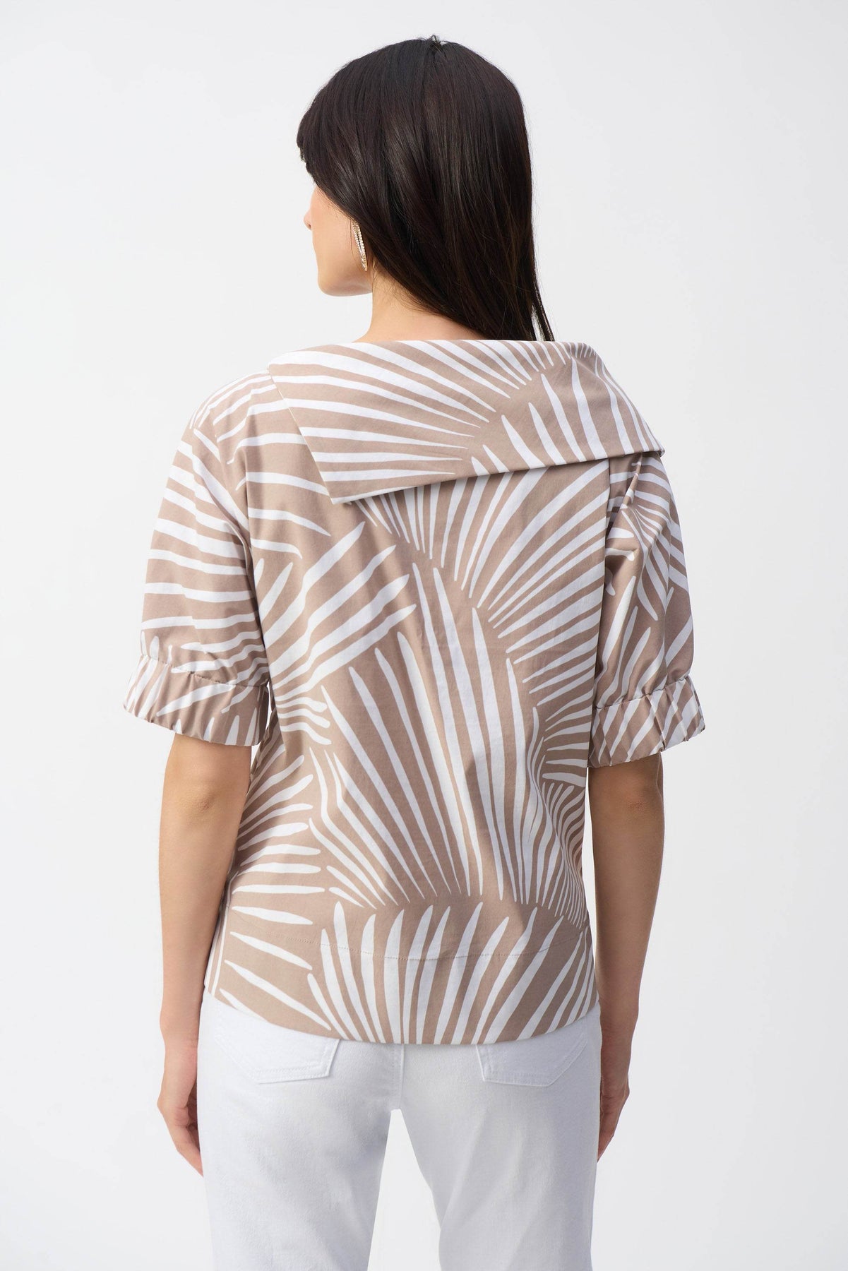 This stretch poplin top brings a unique sophistication that instantly enhances your outfit. Featuring a vibrant tropical print, it highlights the garment’s captivating appeal. The short dolman sleeves with elastic edges and a boat neck with an overlapping collar add a daring touch to the boxy shape. A subtle side slit at the hem completes this elegant and eye-catching piece.