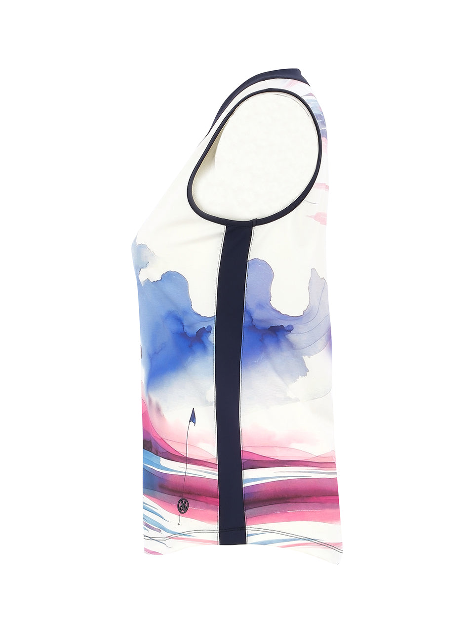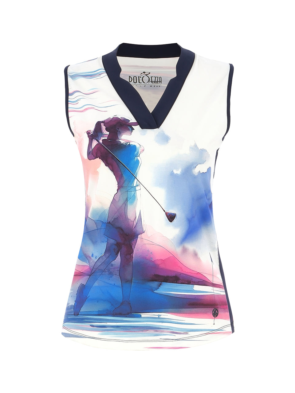 A sporty sleeveless polo top featuring an elegant watercolor-style golf illustration. Designed with a flattering V-neck collar and streamlined silhouette, it offers lightweight comfort and easy movement throughout the day. Perfect for the course or casual resort wear, this artistic piece blends athletic performance with graceful style. ⛳